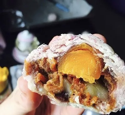 4.準(zhǔn)備好的油皮分成25g/個、油酥15g/個,油皮壓扁,放入油酥,包起來收口朝下。