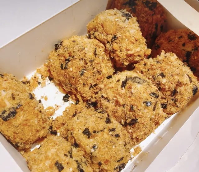 7.烤好取出晾涼,取一片擠上沙拉醬,然后用另一片蓋上,然后在雙面都擠滿沙拉醬。8.最后裹上滿滿的肉松就做好啦。