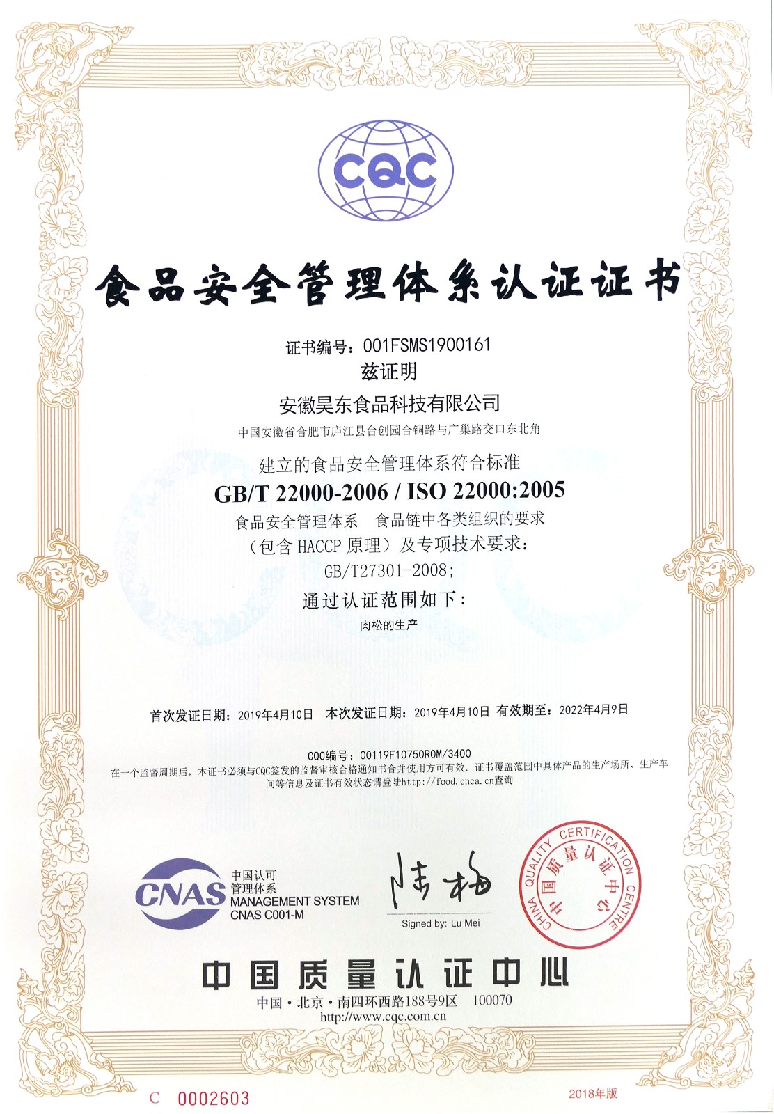 • 食品安全管理體系認(rèn)證證書(shū)