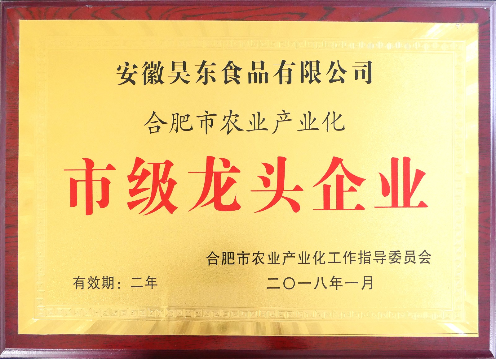 昊東食品市級(jí)龍頭企業(yè)證書(shū)