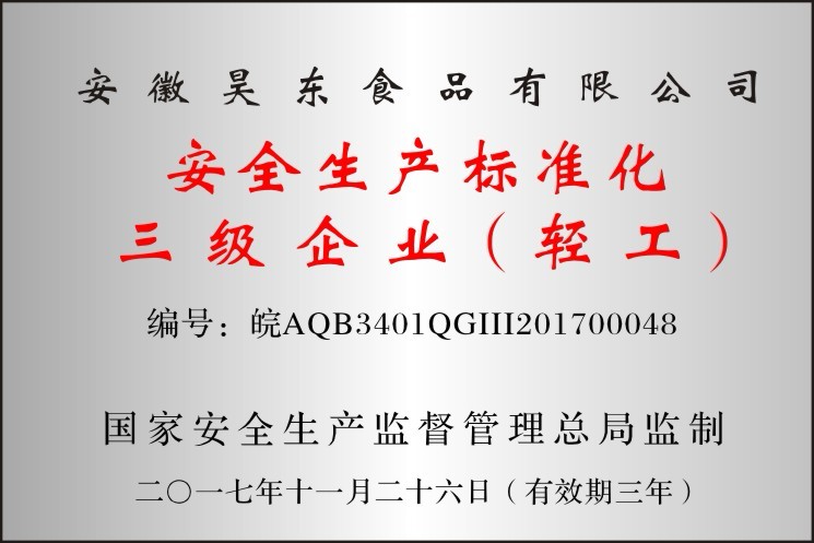 • 昊東食品三級(jí)企業(yè)證書(shū)
